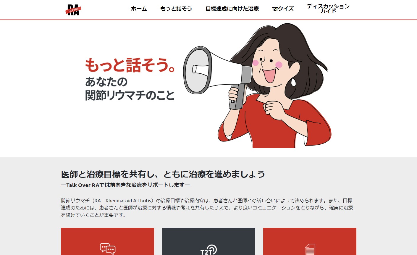 T2Tに基づいて治療を進めていく上では、あらゆる「ツール」が味方になる。金子:製薬会社が提供している患者さん向けの冊子や情報サイトを患者さんに紹介することがあります。たとえば、アッヴィが展開するウェブサイト「Talk Over RA(トーク オーバー アールエー)」もその一つです。同サイトは、関節リウマチのエキスパートの医師や、患者さんで構成されるコミッティ監修のもと、関節リウマチにおける目標達成に向けた治療をサポートするための知識やツールを提供しています。T2Tをクイズ形式で学ぶことのできるT2Tクイズなどのコンテンツがあるほか、この度新たなコンテンツとして、T2Tを実践する上で患者さんが知っておくべきことや、医師とのコミュニケーションのポイントをわかりやすくまとめた「T2T実践ガイド」が公開されました。